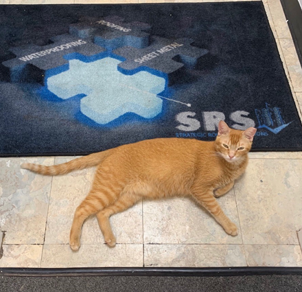 “ISO” stumbled across us one morning several years back in 2019. He was all beat up, malnourished, but was a fun and friendly cat. We took him in and let him hang around our shop feeding him and getting him healthy and he never left. He is always greeting all the crew as they arrive each morning and inspecting all the trucks before they leave. He does everything he can to get some pets before the crew heads out each day. He is a part of the SRS team as much as anyone now.